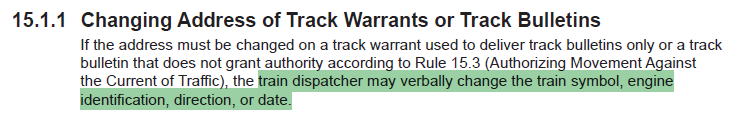 On a track bulletin that does NOT grant authority, the dispatcher may verbally change: - Train symbol - Engine identification - Direction - Date - The "OK" time cannot be verbally changed.